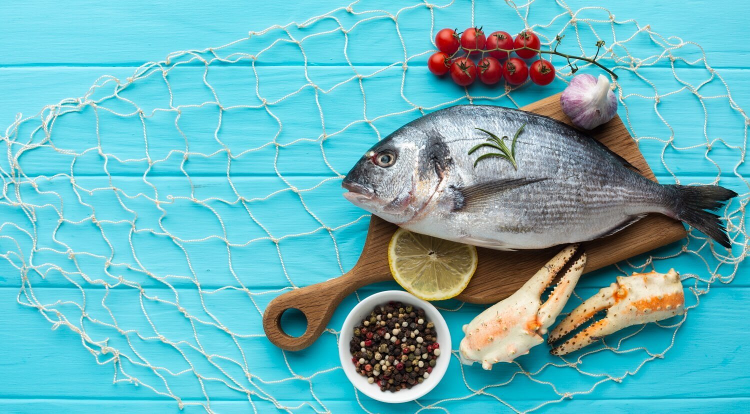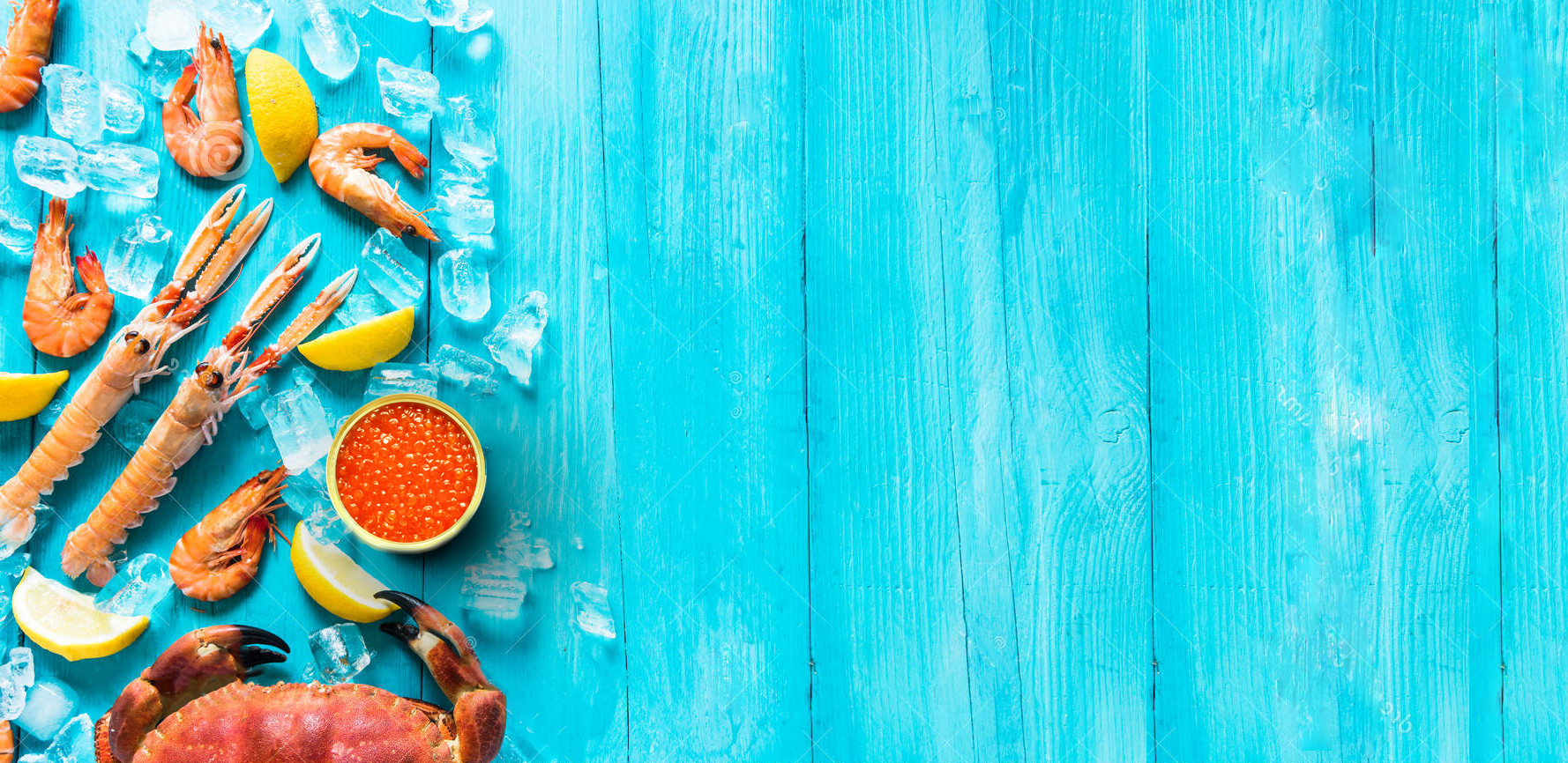 Морепродукты на голубом фоне