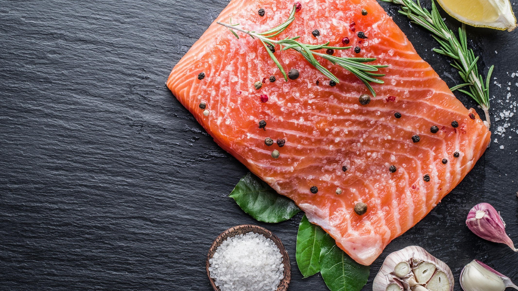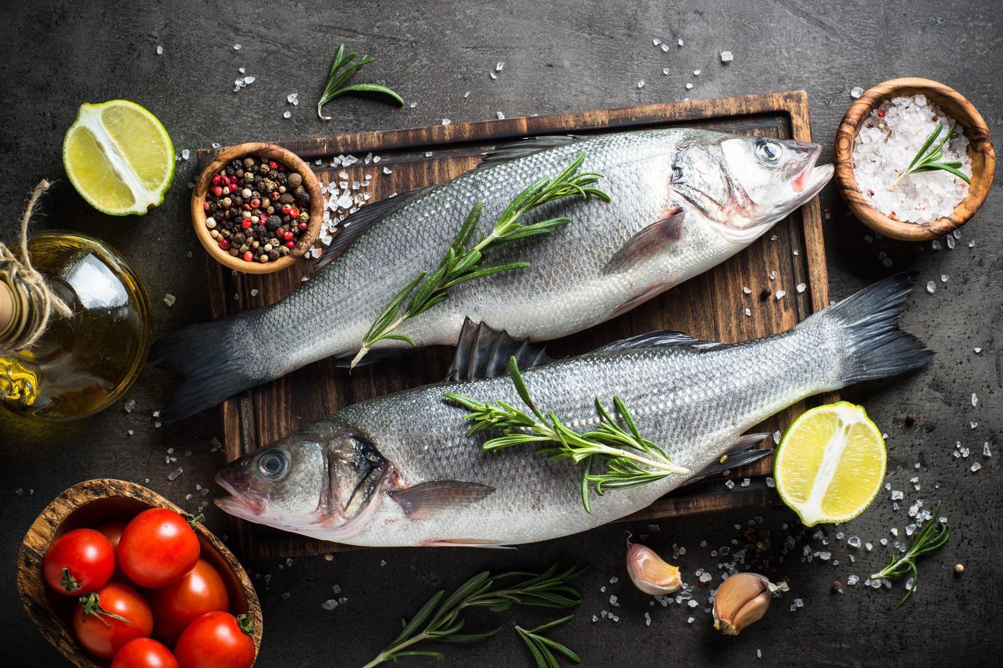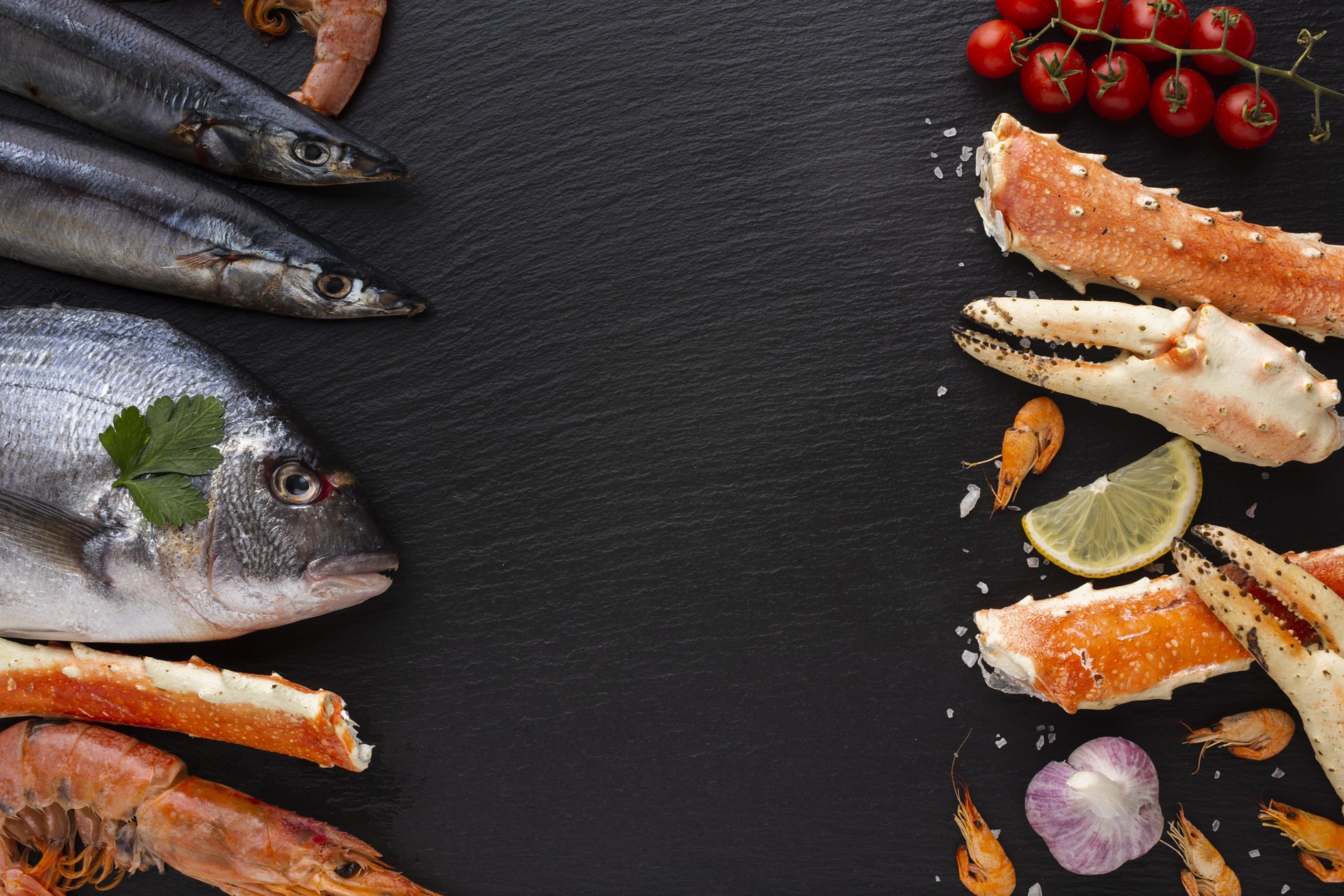 Рыба и морепродукты на темном фоне
